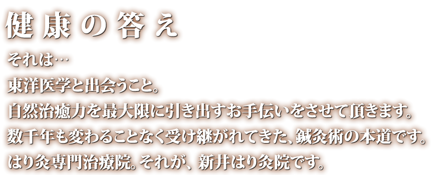 今年で39年目に入りますが修業時代(東洋はり医センター、福島弘道先生に師事)を含めますと44年間、鍼灸治療に携わっていることになります。おかげさまで多くの方と出会い、そして共に病と向き合っていく機会を頂いてきました。今現在は新井康弘・敏弘を中心としたスタッフで鍼灸治療に臨んでいます。 当院では、指圧やマッサージは致しません。鍼とお灸だけの専門治療院です。鍼灸がはじめてという方もお気軽にご来院下さい。多くの患者様と良いご縁が生まれますように。心よりお待ちしております。